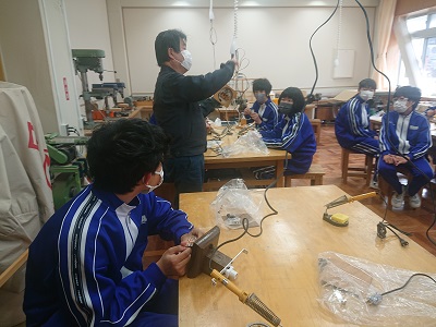 8年生は技術でドーム調光スタンド作成を行っています。今日は、はんだを使って金属の接合を行いました。