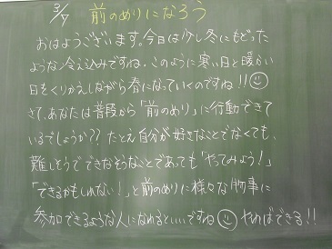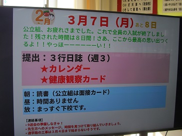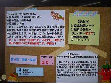 今朝の各クラスのお知らせです。黒板や大型提示装置を使って、子供たちに今日の情報を伝えています。