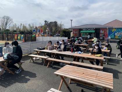 お昼ご飯となりました。青空のもと、黙食でお弁当をいただいています。