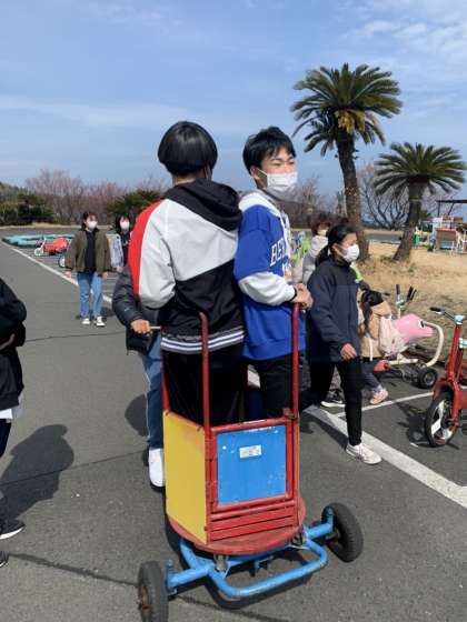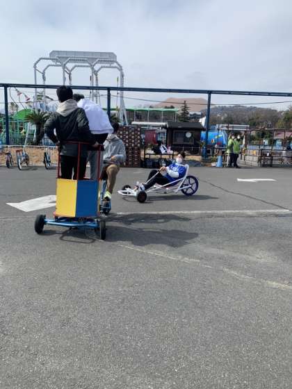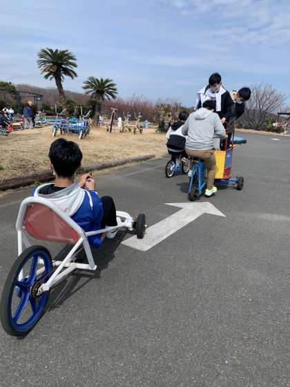 「おもしろ自転車]コーナーでは、みんなで多機能自転車に乗り、楽しんでいます。