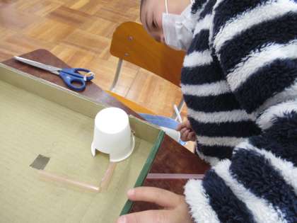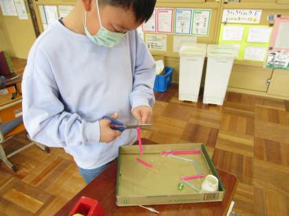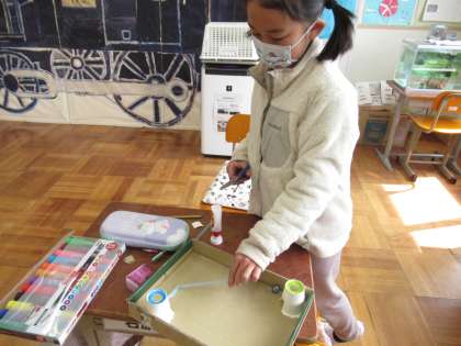 2年生最後の図工では、ビー玉迷路作りをしました。箱に道を作ったり、穴を空けたり、障害物を作ったりして、たのしい迷路を作りました。お互いに交換して楽しみました。
