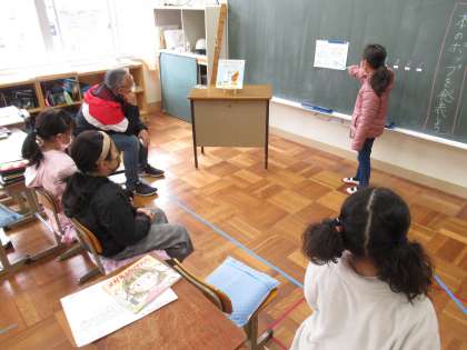 おすすめ本の紹介をしています。なぜその本がおすすめなのか、どんな場面が好きかなど、本のポップを作って紹介しました。みんな上手に伝えることができました。