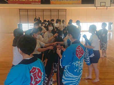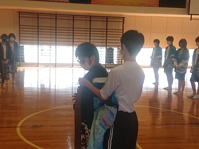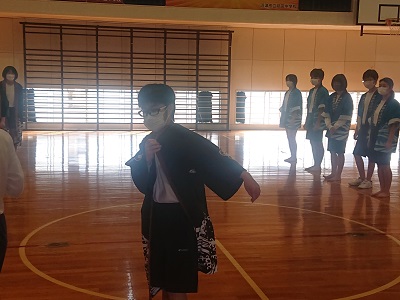 9年生がソーランを披露した後、9年生から8年生に法被(はっぴ)の贈呈式がありました。8年生は合わせて「伝統」というバトンを受け継ぎました。4月から最上級生として、学校を引っ張るリーダーとしての活躍を期待しています。
