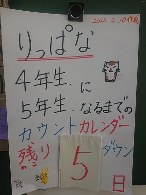 3・4年生の教室に掲示してあるカウントダウンカレンダーです。「りっぱな4年生、5年生」になれるよう、一日一日を大切にしていきましょう。