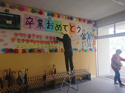 もうすぐ戸田小中を卒業していく9年生に向けて、児童生徒玄関に飾り付けをしました。