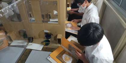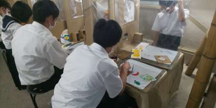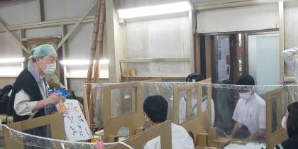 友禅染体験です。型紙を選び、彩色の仕方を学びました。時間が経つにつれ、楽しさを感じ、夢中になっていました。