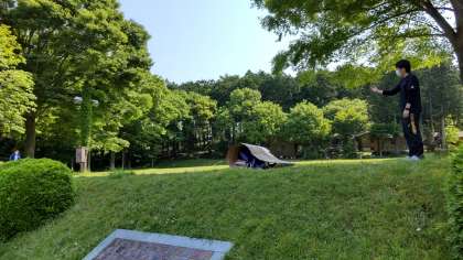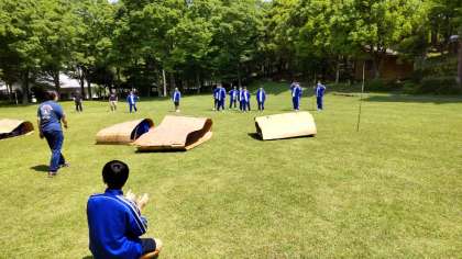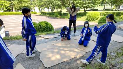 オリエンテーリングの段ボールキャタピラリレーが終わりました。第1位は4班でした。おめでとうございます!