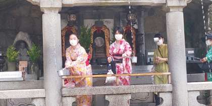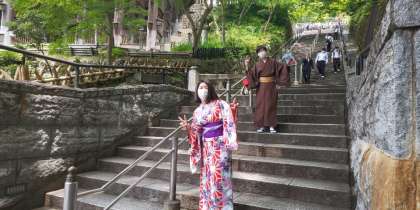 舞台の横を見ながら歩くグループが1つ。音羽の滝に1グループが、立ち寄りました。買い物を終え、クラフトセンターへ着物を返しに行きます。