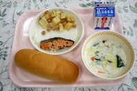 今日の給食は、「ロールパン」「鮭のハーブ焼き」「ポテトとひよこ豆のから揚げ」「鶏...