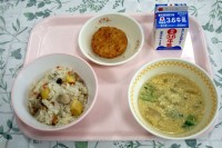 今日の給食は、「吹き寄せおこわ」「さつまいもコロッケ」「かき玉汁」「牛乳」です。...