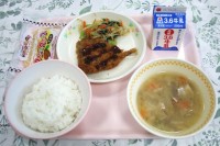今日の給食は、「ご飯」「鶏肉とジャガイモの揚げ煮」「豆腐と野菜のすまし汁」「牛乳...