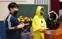 今日は教員による読み聞かせがありました。絵本と同じTシャツを着ている先生、「グォ...